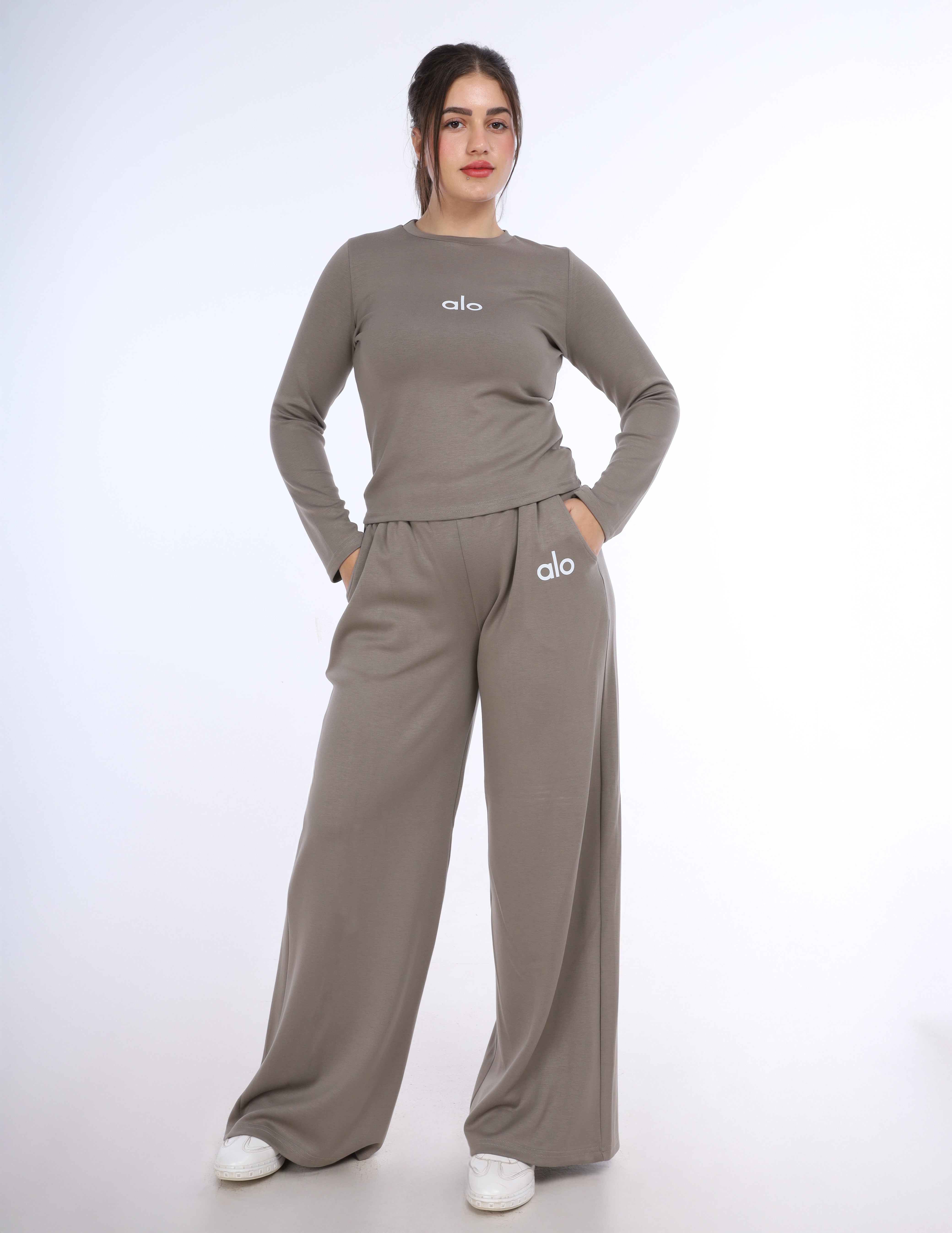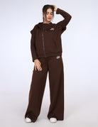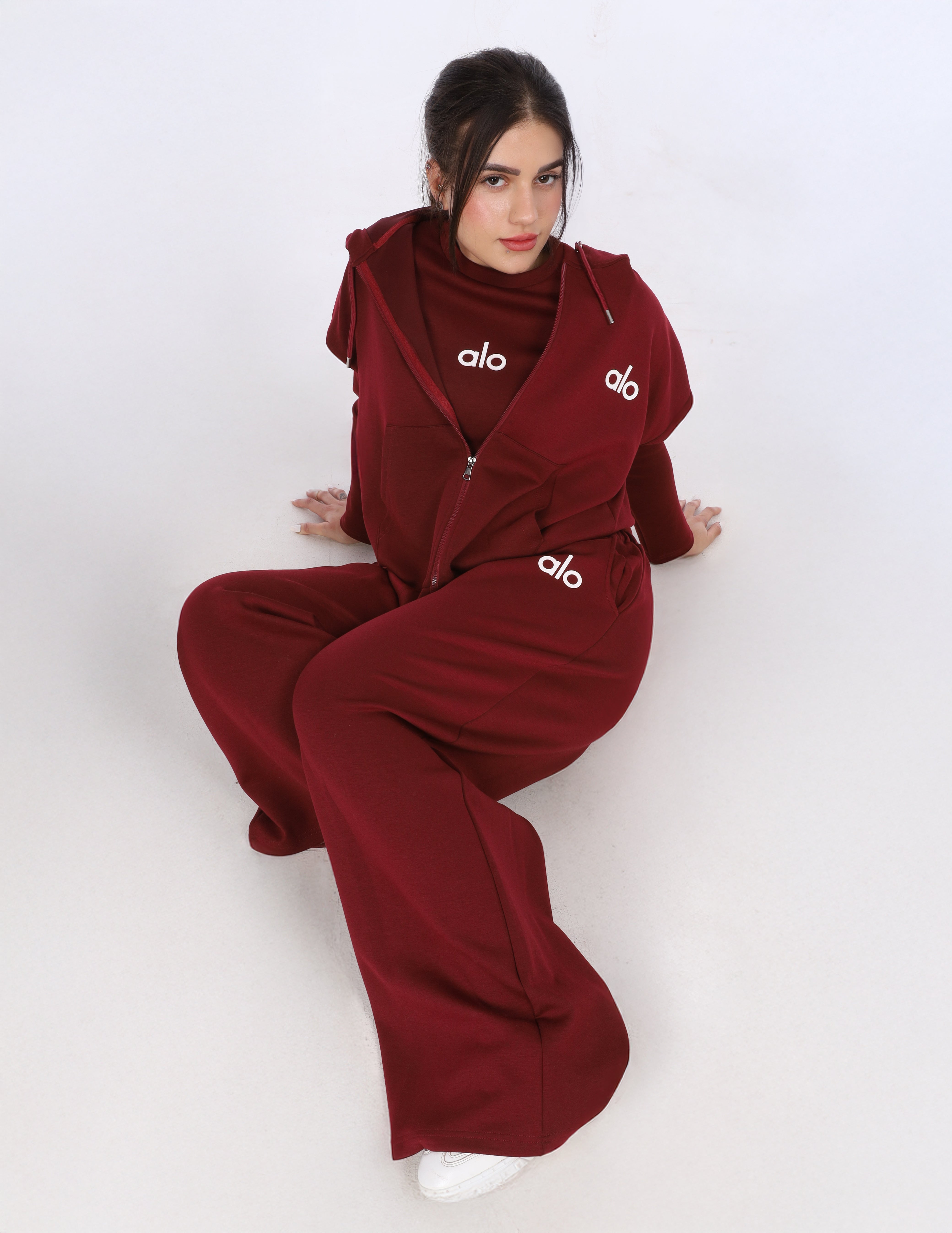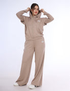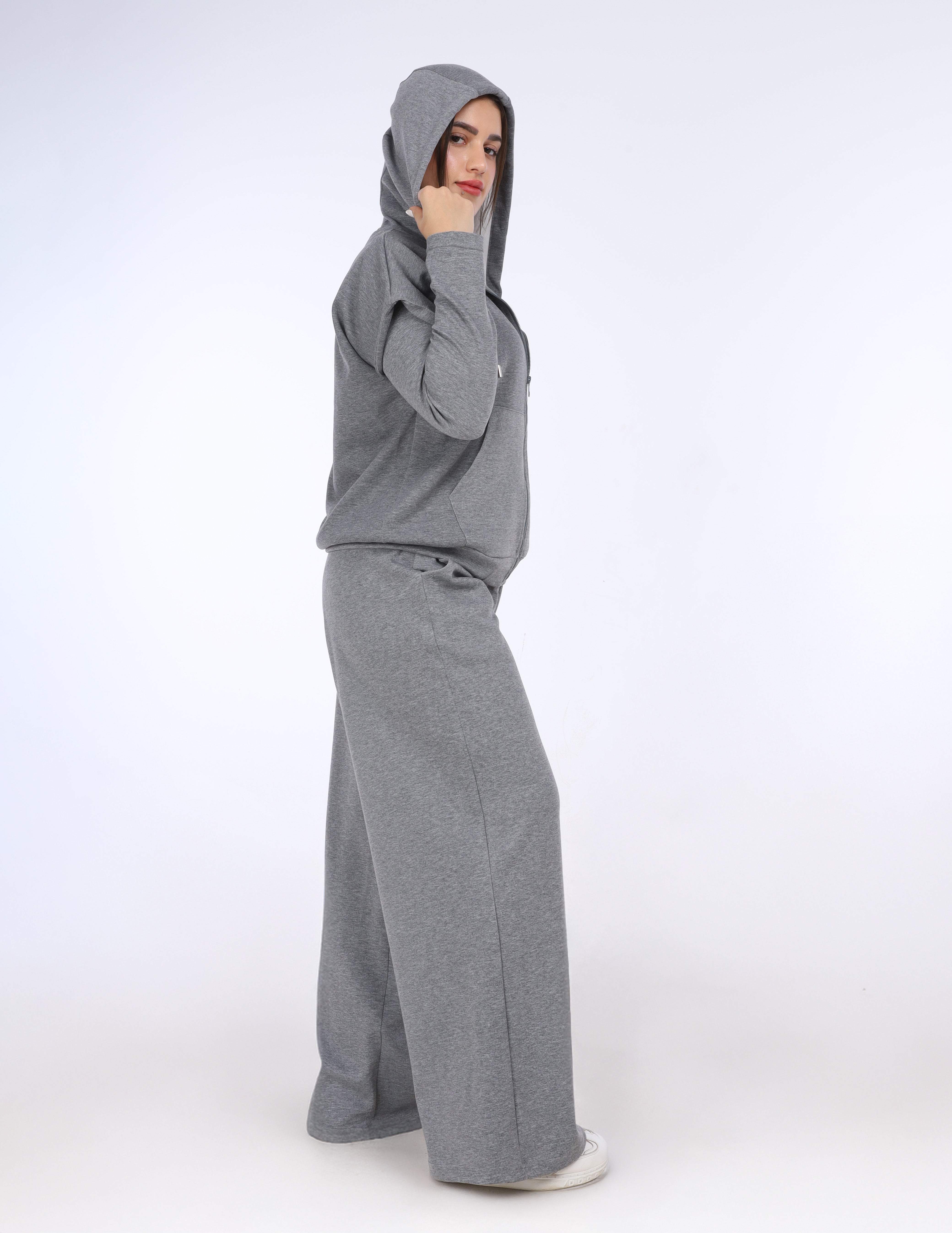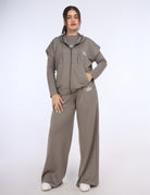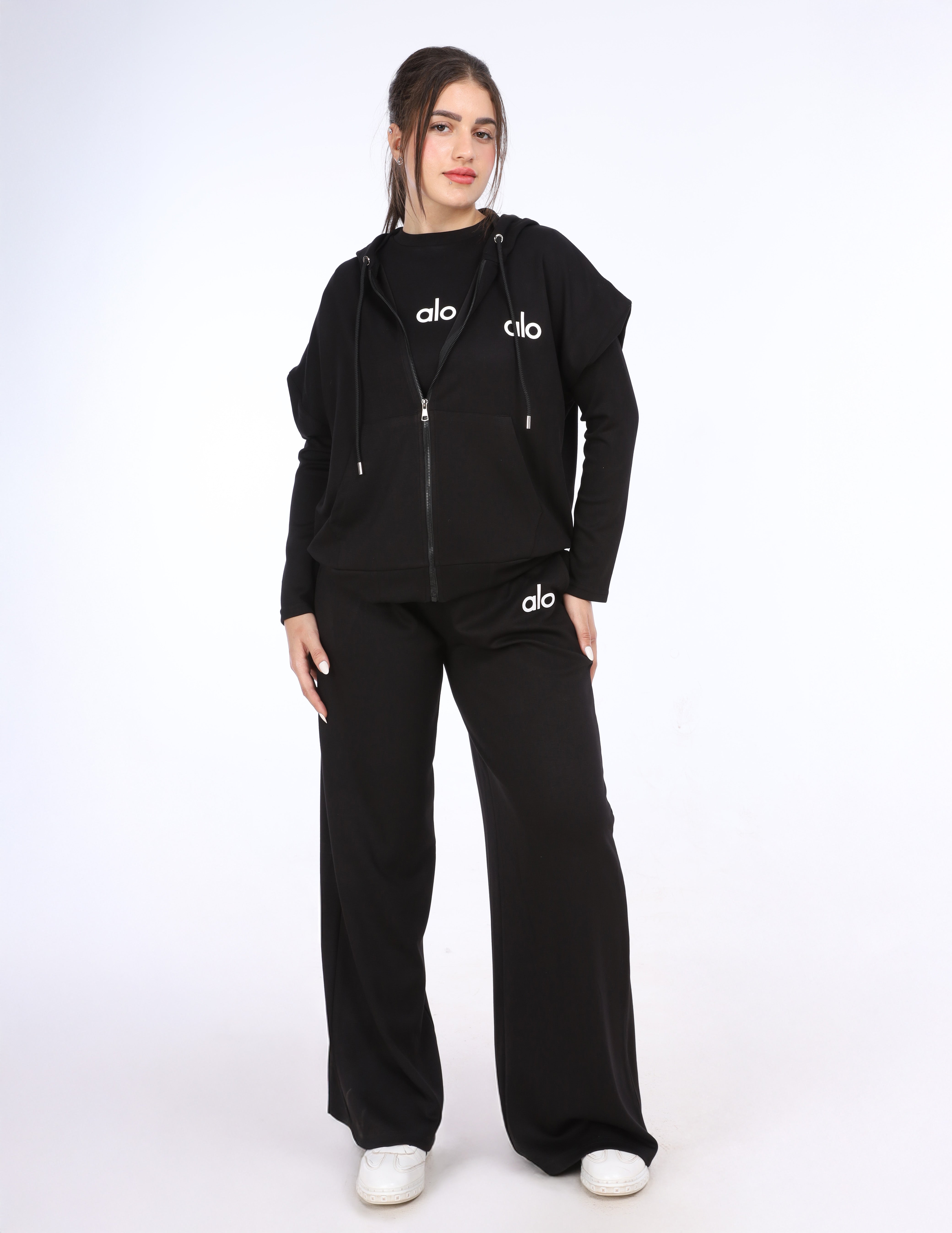 A comfortable 3-piece set including a sleeve top, wide-leg pants, and a half-sleeve zip-up hooded jacket, perfect for casual and athleisure wear.