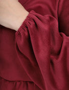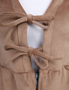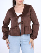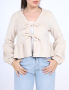 Chic peplum blouse featuring long puff sleeves and a front tie detail