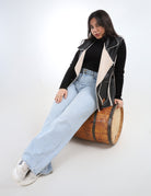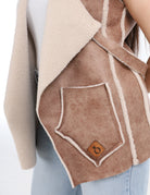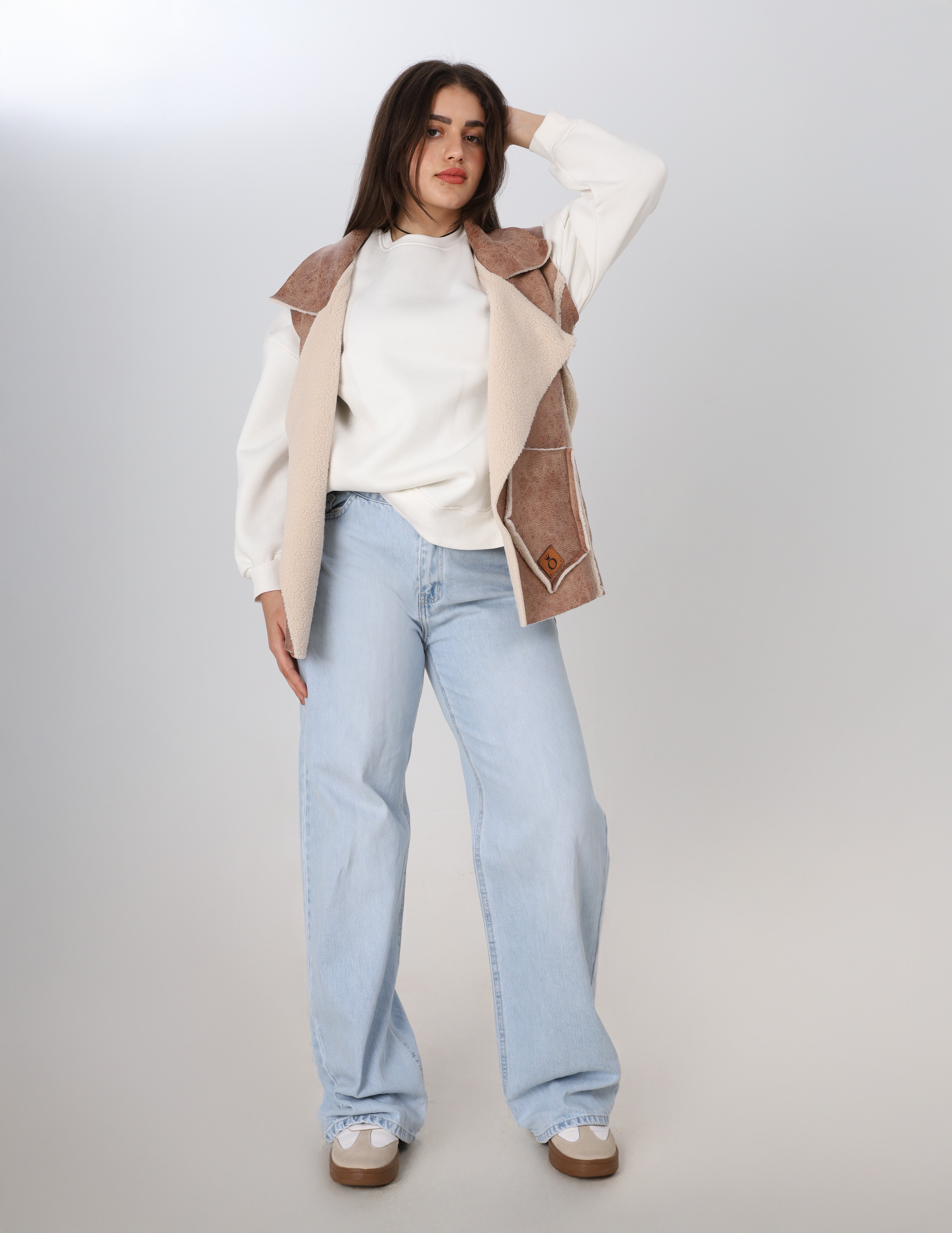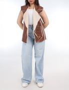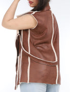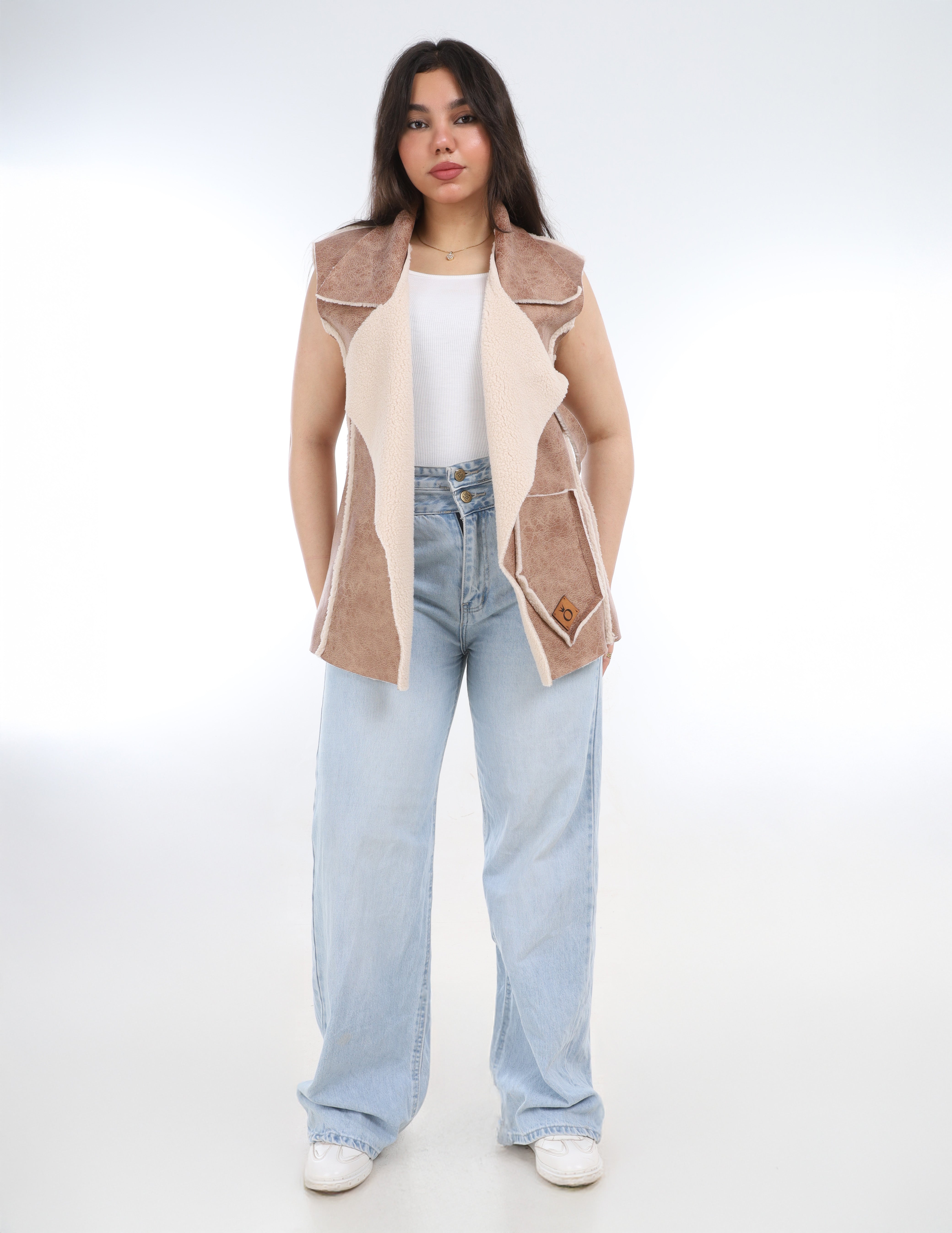 A stylish faux leather sleeveless jacket with a soft, warm fur lining for added comfort.