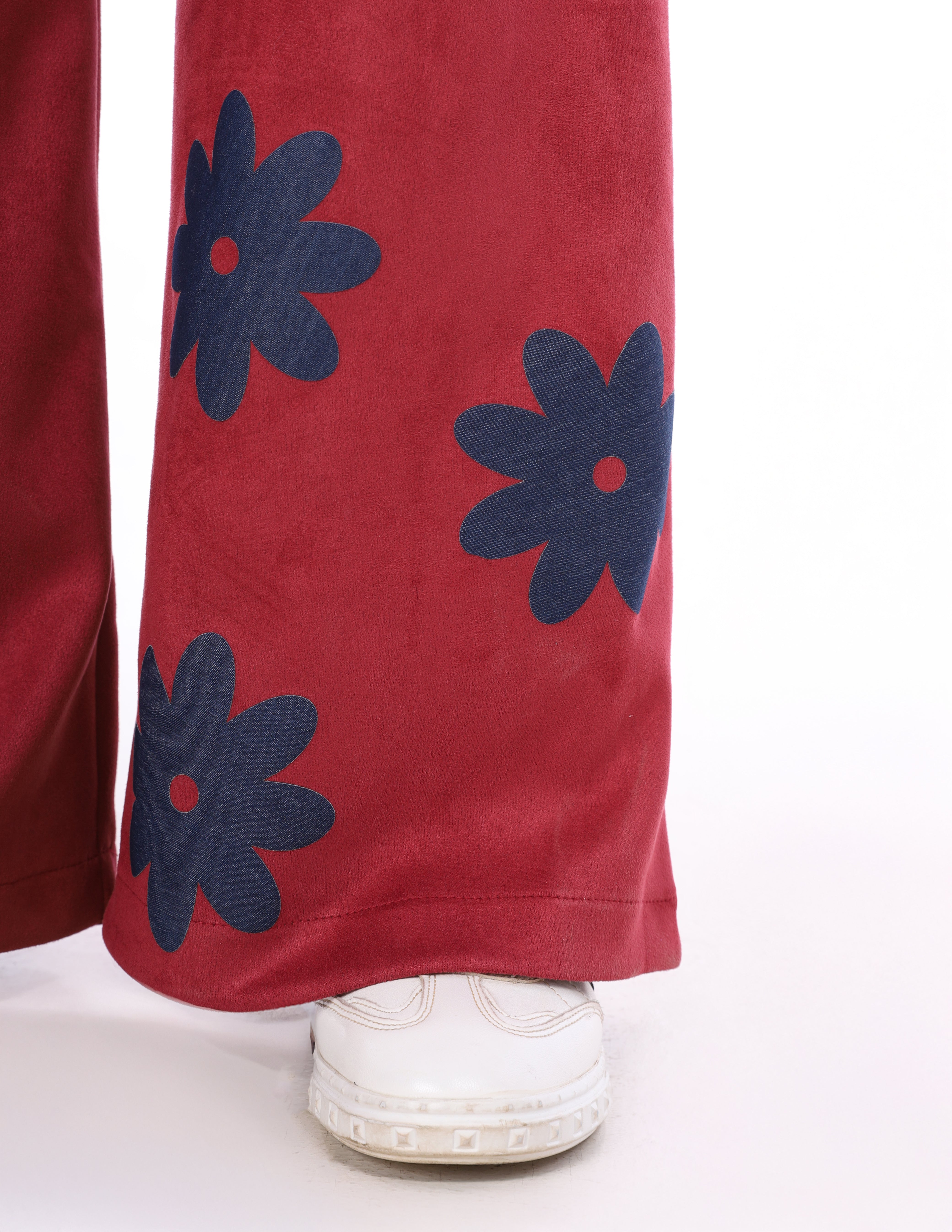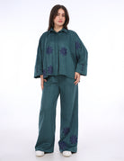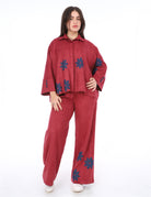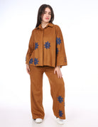 Relaxed two-piece set featuring a loose shirt and wide-leg pants with bold floral embroidery for a stylish casual look.