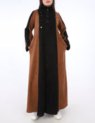 Elegant long suede dress featuring a two-tone design, front buckles, and a high collar for a chic winter look.
