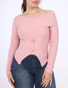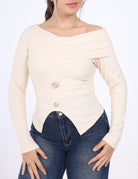 Modern asymmetric shoulder top designed with a sleek, feminine fit.