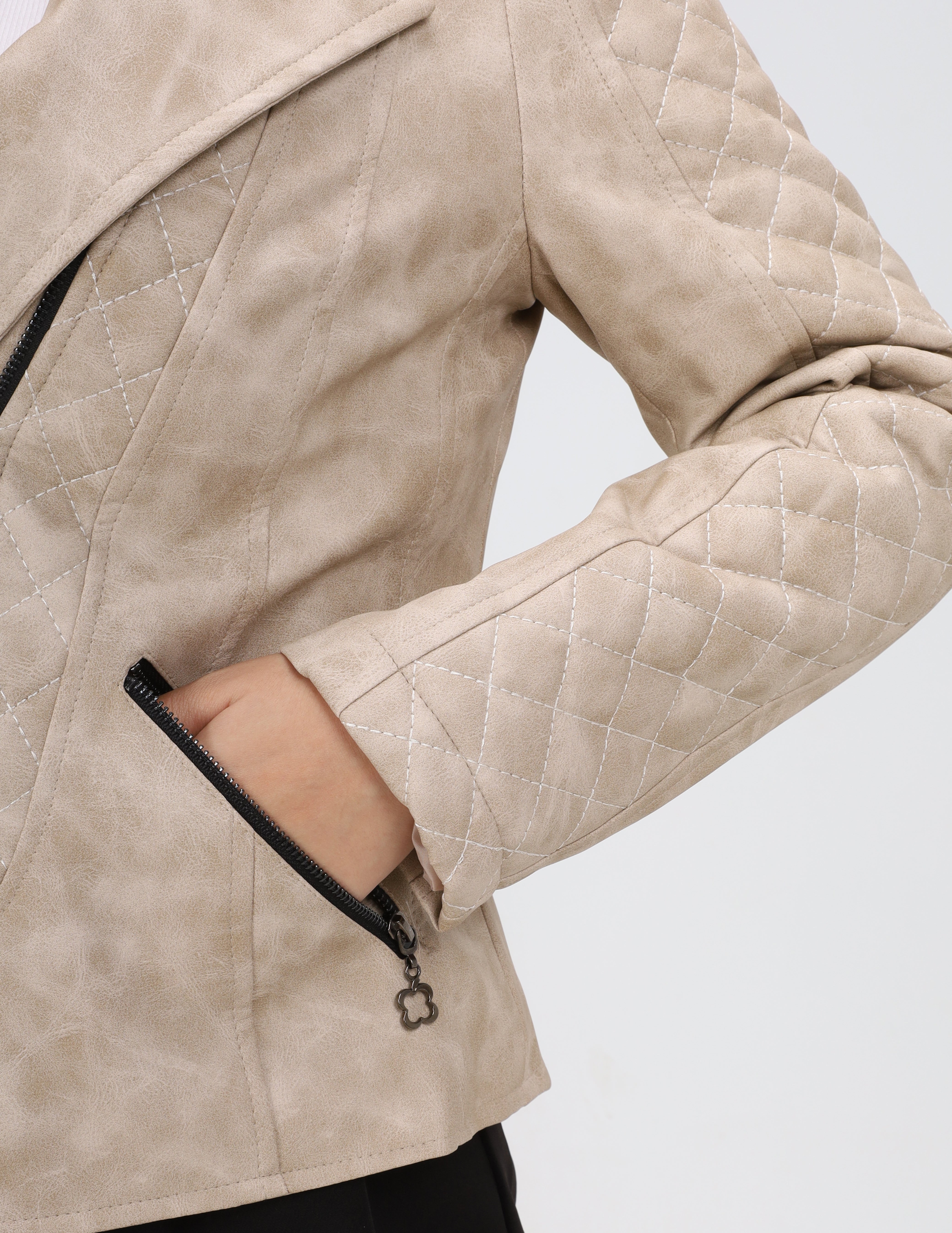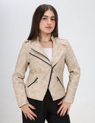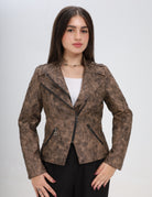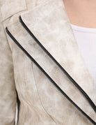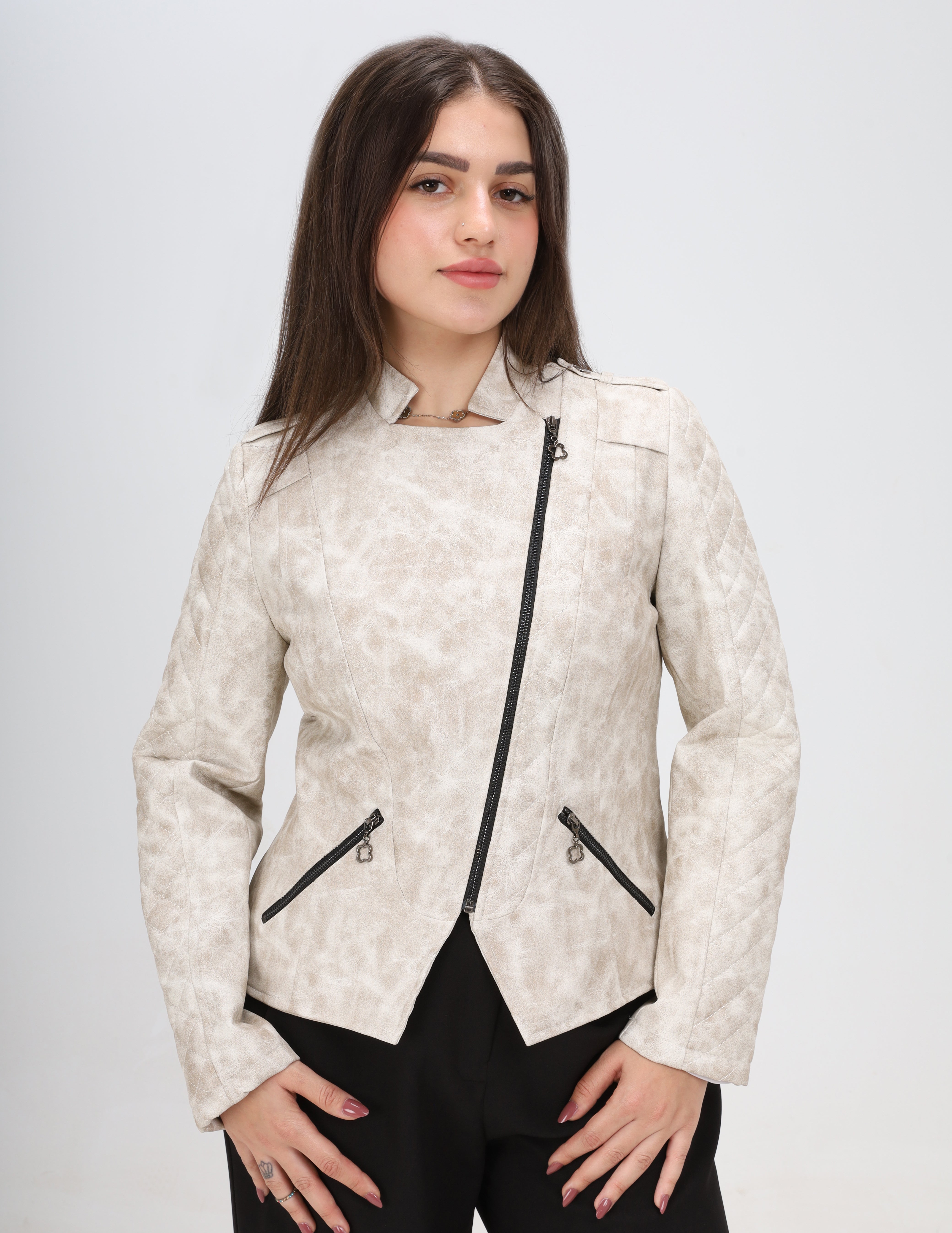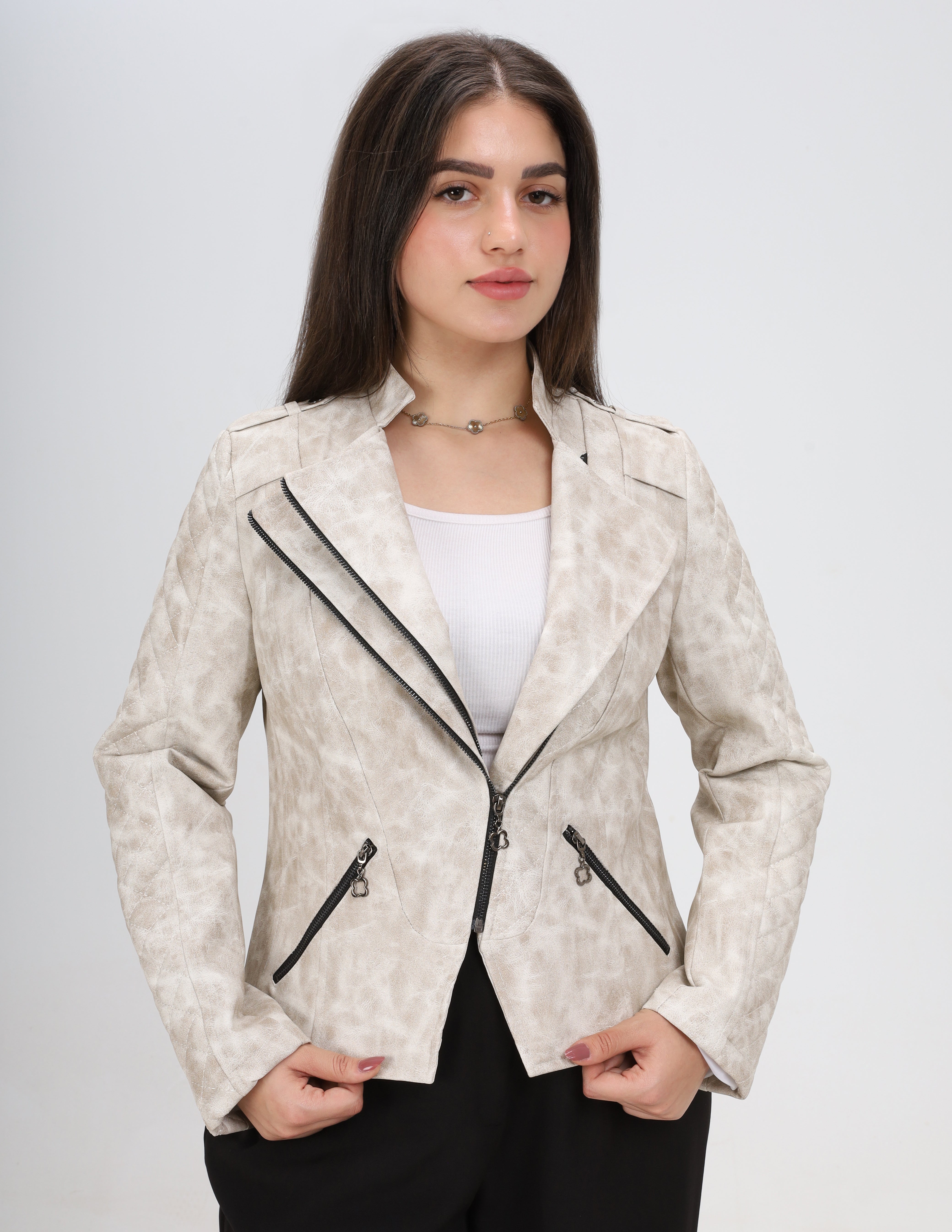 Vintage-style faux leather moto jacket with a distressed finish, asymmetrical zipper, and zip pockets for a sleek modern look.