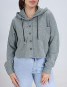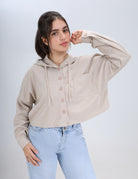 A trendy cropped hooded shirt designed for a casual, modern look.