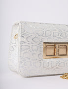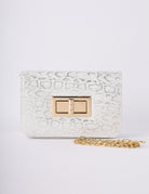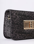 Snake-print clutch with a metallic buckle and a gold chain strap.
