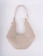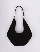 A soft suede hobo bag with a sleek curved shape and adjustable shoulder strap
