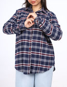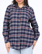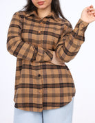 Casual long-sleeve plaid flannel shirt featuring a classic collar and front button closure.