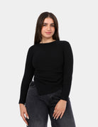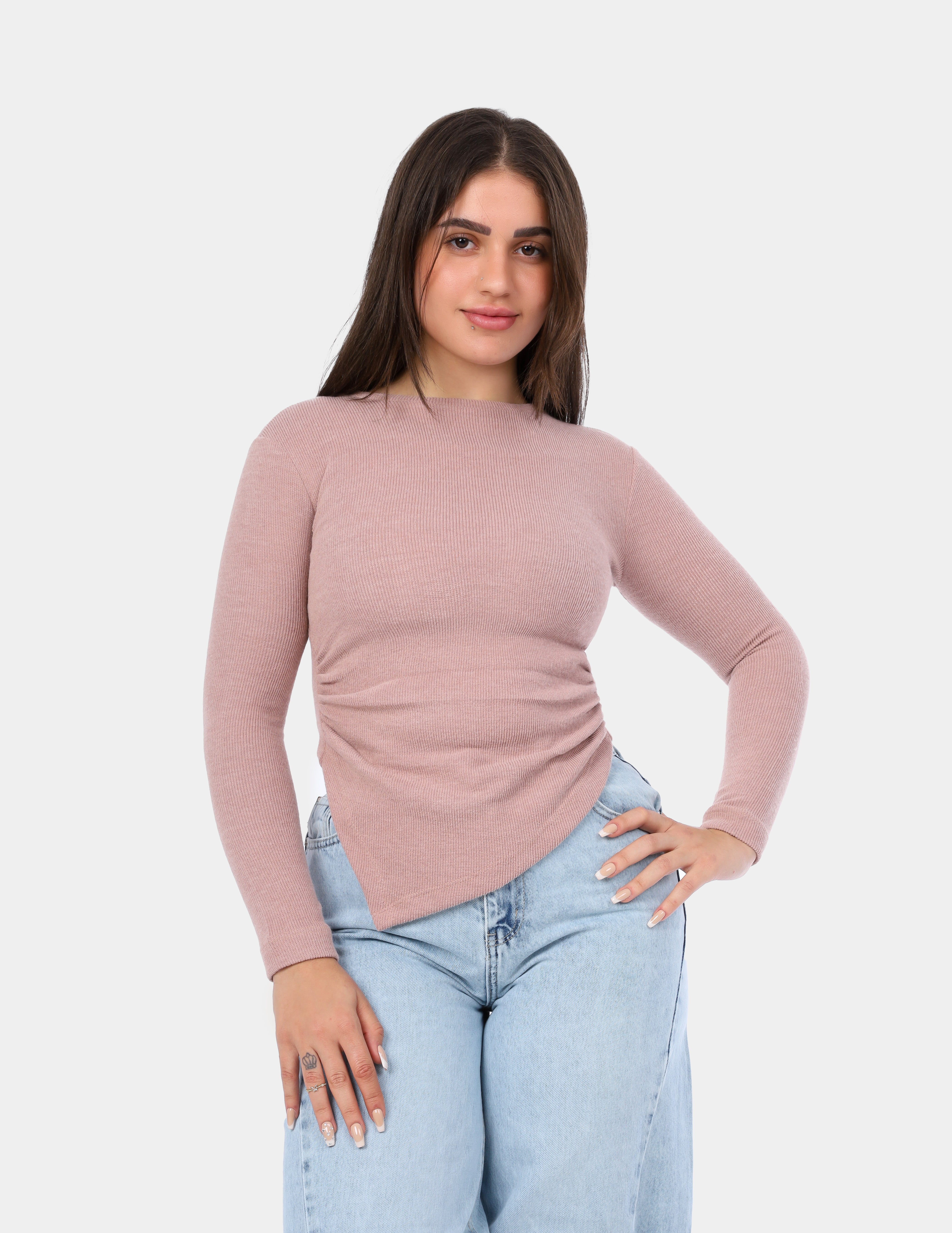 A modern ribbed long-sleeve top designed with a sleek asymmetrical hem that adds a stylish edge to your everyday look.