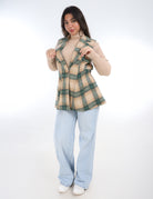 Sleeveless plaid peplum blazer with a front button and a flattering waistline. Perfect for chic layering.