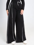 Melton pants with white side stripe and elastic waist for a comfy fit.