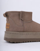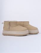 Soft winter suede-look boots with warm faux-fur lining, lace-up details, for cozy cold-weather comfort.