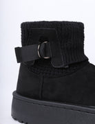 Soft suede-look ankle boots with a warm knitted cuff, side buckle detail, and a comfortable winter-ready sole.